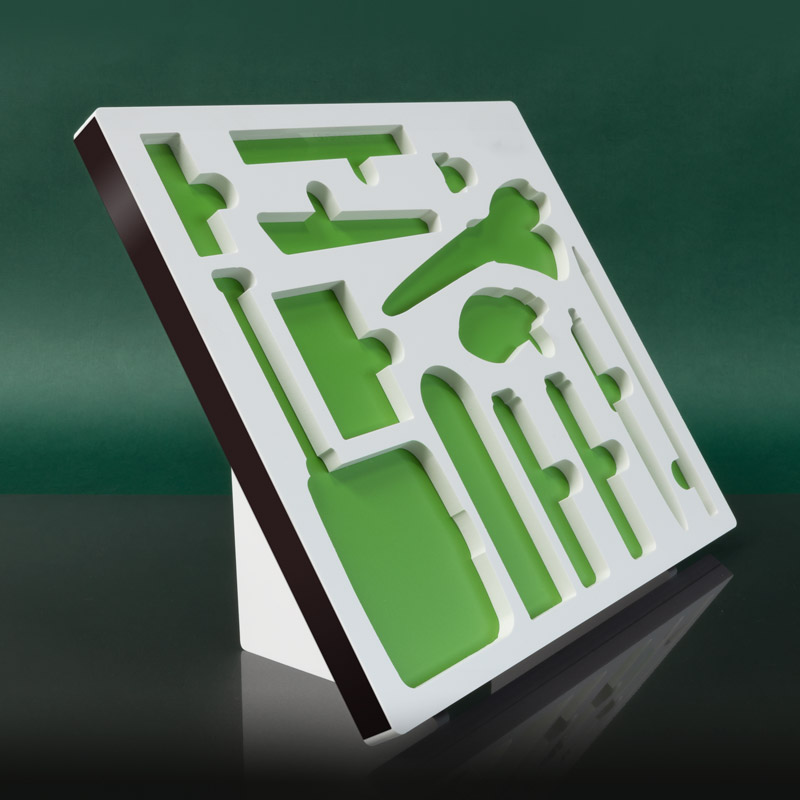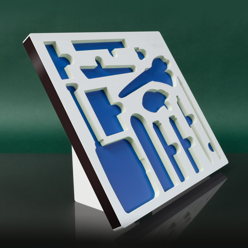 Shadowboard aus 20 mm PVC-Hartschaumplatte, Tiefe der Aussparungen 10 mm, mit zwei Standfüßen zum Einstecken. Inlay farbig bedruckt, passend zum Hefter-/Locher-Set. Magnetfolie auf der linken Seite zur Aufbewahrung von Heft-/Büroklammern.