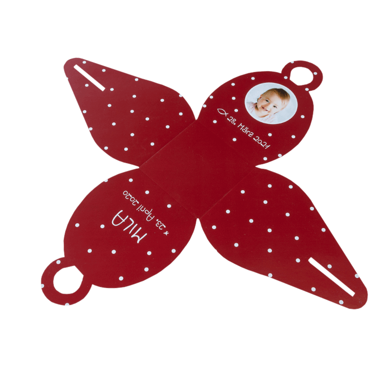 Die Innenseite der Schachtel ist in derselben Farbe wie die Außenseite bedruckt. Die Taufboxen werden plano und ohne Inhalt zum selbst zusammenfalten geliefert.