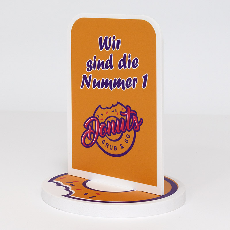 Display-Aufsteller aus weißem PVC-Hartschaum, beidseitig bedruckt im Format 100 × 148 mm, inklusive bedruckbarem Sockel (Ø 120 mm) zum Stecken.